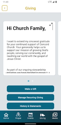 Connect and Engage with the Concord Church app! You will be able to update your profile, connect with your ministry, send prayer requests, give, sign up for special events, and more! With our app you can stay updated with messages in the feed, access church directories, and explore the Media section to view the latest video/audio sermons.