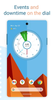 The scheduler works like an analog clock face. It automatically fetches all the events from your Google calendar (or local calendar) and places them on a 12-hour sectored watch face. This technology can be called a "Calendar clock".